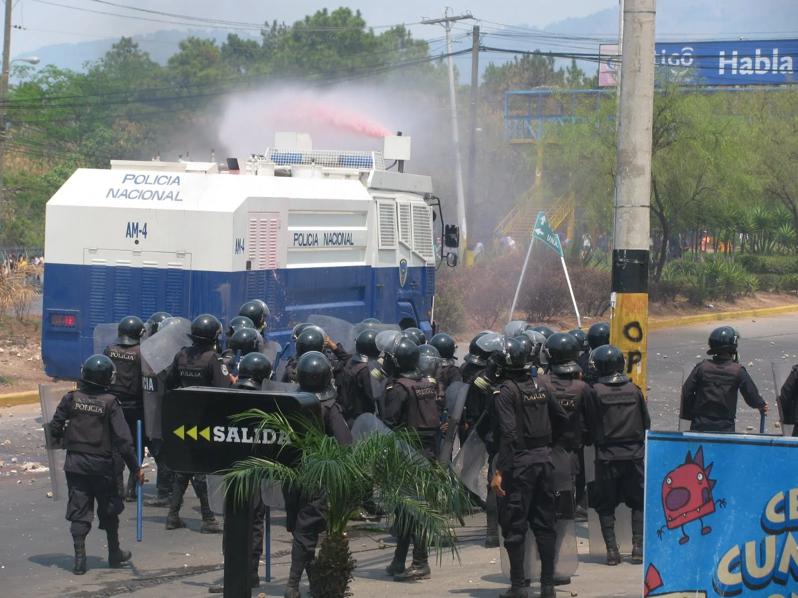 At the UNAH, I spent roughly two hours behind a line of police heavily armed (likely by US and Canada military aid to the post-coup regime) and in full riot gear they shot tear gas, threw rocks, sprayed high-pressured water from tanks at student protesters at the National Autonomous University.